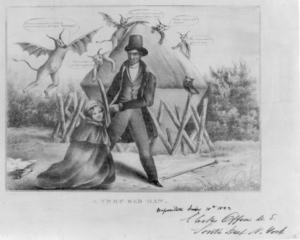 1833 print by Henry Robinson titled “A Very Bad Man” depicts Ephraim Avery and Sarah Cornell