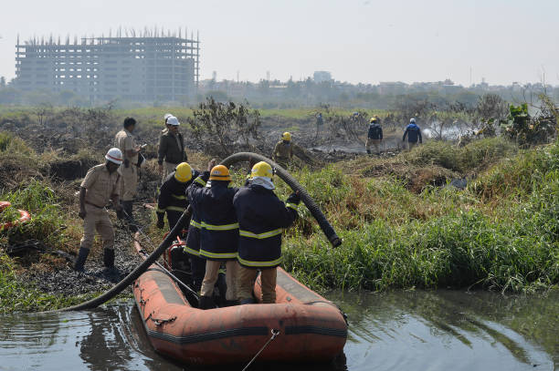 (Firefighters extinguish a fire on Bellandur Lake. Photo credit: MANJUNATH KIRAN via Getty Images.)