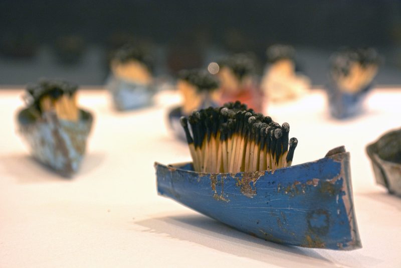 However, no amount of inclusion of Kourbaj’s art throughout the exhibit mitigated the fact that it seemed to sit on top of, rather than inform, the rest of the exhibit. Kourbaj’s “Dark Water, Burning World,” a modern recreation of 5th century BCE Syrian sea vessels made from matchsticks and recycled bicycle parts, served as a powerful commentary on the changed relationship of Syrians to the Mediterranean as refugees. However, the artifacts used as the point of reference, held by the Fitzwilliam Museum at the University of Cambridge, provided their own irony: Kourbaj’s access to his cultural heritage is mediated through a European museum and its own claim over them.
