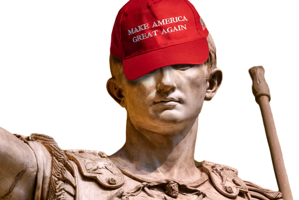 (MAGA hat on a Caesar statue. Image source: Boston Globe Staff Illustration)