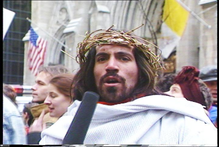 Camp is about making fun, subverting meaning, mocking authority—not things most modern Americans or scholars of religious studies would align with “religion.” But it also requires deep attachment, even intimacy, with the thing that becomes the object of camp. Navarro’s drag re-signifies Jesus in at least two ways. He reclaims Jesus from Christian conservatives but also resurrects Jesus for queer and feminist activists. In his performance, Jesus becomes a figure to play with as well as one to aspire toward, even to inhabit. Navarro’s Chicano AIDS activist Jesus thus becomes not only another representation of the Son of God, but also a performance that makes Jesus present as a feminist and queer activist.