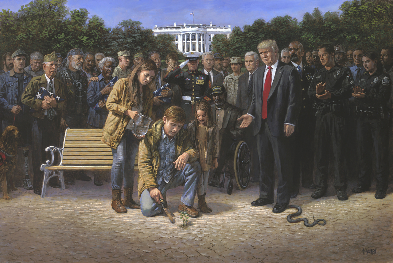 McNaughton’s most famous painting, 2010’s The Forgotten Man, depicts the White House in an eerie twilight with a gathering of the first 43 presidents, including an argumentative Abraham Lincoln and a grimly constipated Ronald Reagan, behind the dejected titular (white) everyman who looks like he just missed a Gander Mountain sale. Standing apart is a haughty Obama, his foot on the Constitution, with an angry James Madison gesturing as if toilet paper was stuck on the 44th president’s blucher. Yet few of McNaughton’s stunningly unsubtle images quite capture the myopic hypocrisy of the religious right as fully as his addendum to The Forgotten Man, his 2017 piece entitled You are Not Forgotten.