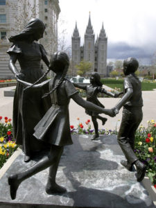 A statue representing womanhood, and women’s role in raising children, with the LDS Temple in the background in Salt Lake City, Utah