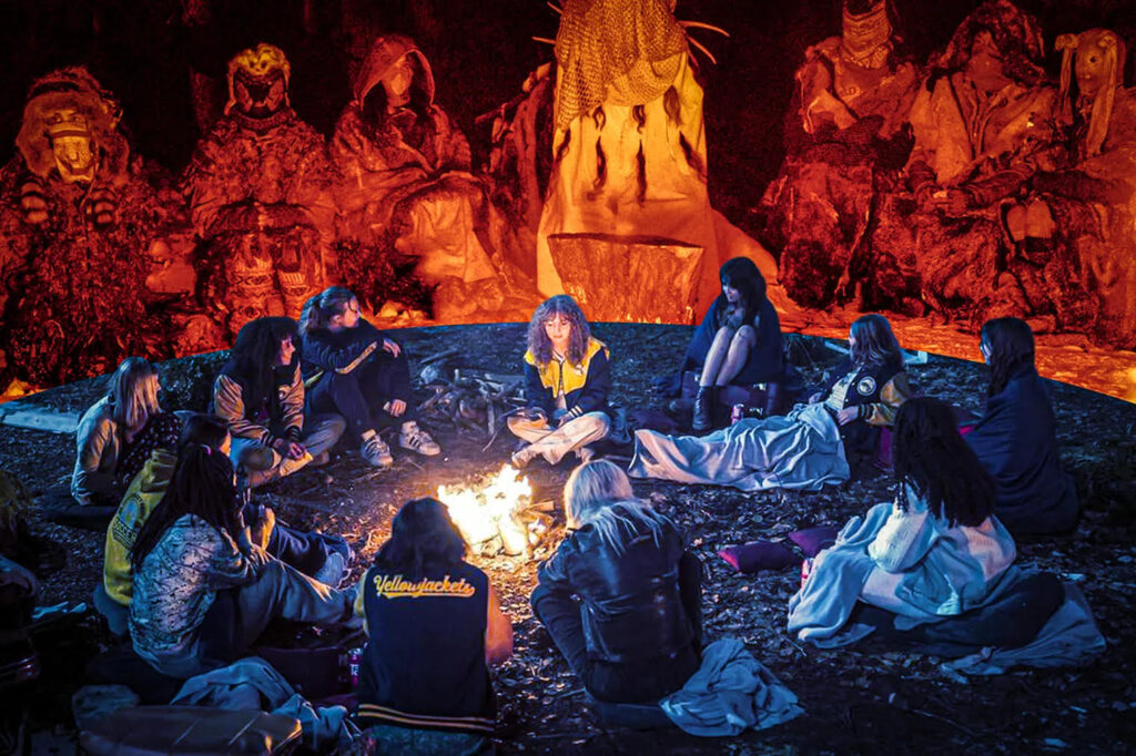 Yellowjackets, streaming on Showtime, focuses on a girls’ high school soccer team from New Jersey who, together with the team’s male assistant coach and head coach’s two sons, survive a plane crash in the Canadian Rockies on their way to the 1996 championships. Stranded in primitive conditions for nineteen months, not all of them make it out alive. The ritualized cannibalistic survival tactics of those who do are the show’s main focus.