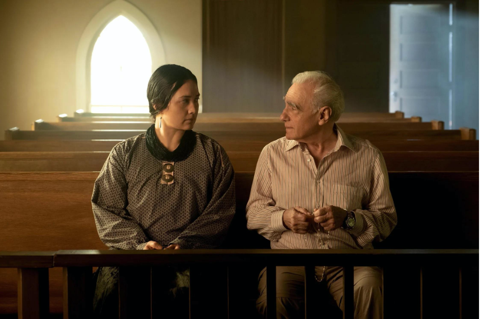 (Scorsese holds a pair of rosary beads in a pew next to Lily Gladstone on the set of the film’s chapel.)