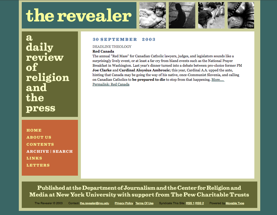 The Revealer was originally started nearly 15 years ago, in September 2003. Since then, as the magnificent Internet Archive Way Back Machine will show you, the site has had its share of makeovers.
