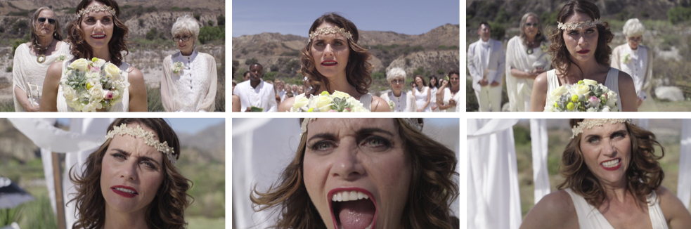 The photography session gives way to the wedding ceremony itself. While walking down the aisle, Sarah transitions from the outward context of family performance to an unsettled space of inner conflict. She steps off with a broad smile, crowned by a circlet of flowers, bouquet in hand. After several paces, she shifts her gaze from side to side, taking in the ideal wedding image that surrounds her. By contrast, filmed in slow motion and extreme close-up, Sarah’s facial expression reveals a darkening mood. Anxious and dubious, she approaches the chuppah. Intercut images of Tammy’s wide grin and an irenic rabbi clash with Sarah’s screwed-up face, her expression rocketing between perplexity and rage. The soothing melody of Wagner’s “Bridal Chorus,” strummed on acoustic guitar, gives way to disorienting acoustic snippets of the rabbi and Tammy reciting liturgy and vows. The nuptial performance complete, the rabbi shouts, “who thinks we should break some glass?” With bared teeth and stomping feet, the ceremony is complete.