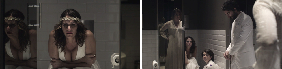 Between the mirrored bathroom stalls, Sarah undertakes a counter-performance through which she negates the ritual practice of the wedding ceremony. Seated on a toilet, not standing beneath a chuppah, she receives acknowledgement of her unmarried status. Even more, this time, rather than exchanging vows with a potential spouse, Sarah questions the bonds of loyalty shared between siblings (“Why did you let me marry her?”).