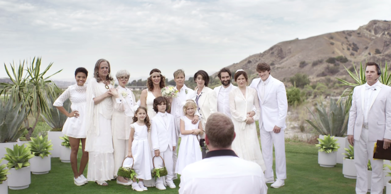 The first episode, titled “Kina Hora,” depicts the wedding ceremony for Sarah’s marriage to Tammy Cashman (Melora Hardon). Establishing dramatic tension through a single four-minute take, the episode opens with the Pfefferman family posed for a wedding portrait, all dressed in white on the manicured lawn of a Palm Springs resort. In front of the camera, children complain (“I’m hot”), adults primp (“Did you want my chin up or want my chin down?”), and brides give direction (“Everyone focus!”) until the scrum breaks after the photographer refers to Maura in the male gender (“I think chin up for you, sir.” “Did he call me sir? We’re done.”). Through this group-photo mini-ritual, Soloway presents Sarah’s family as a cacophony of self-interest, a collection of personalities drawn together by family ties, but marked by stark individuality.