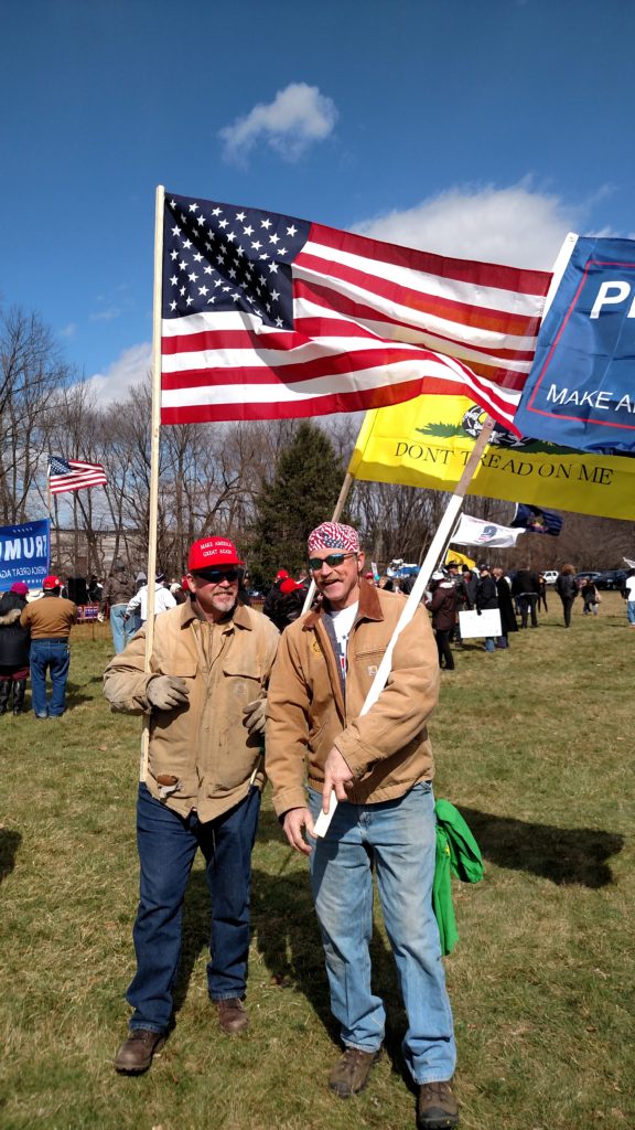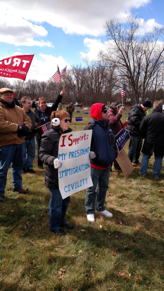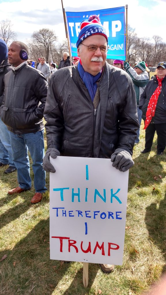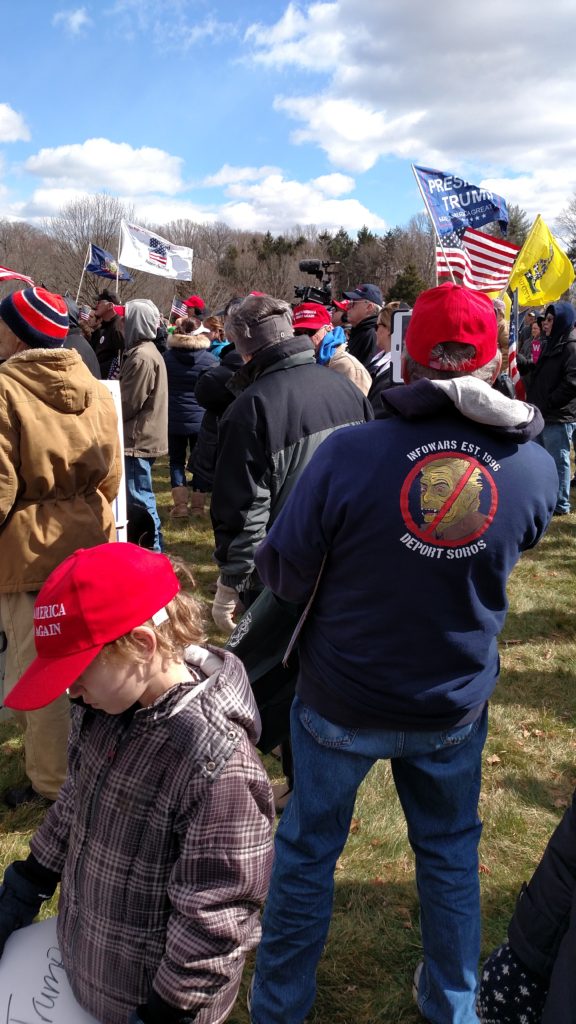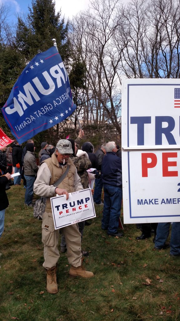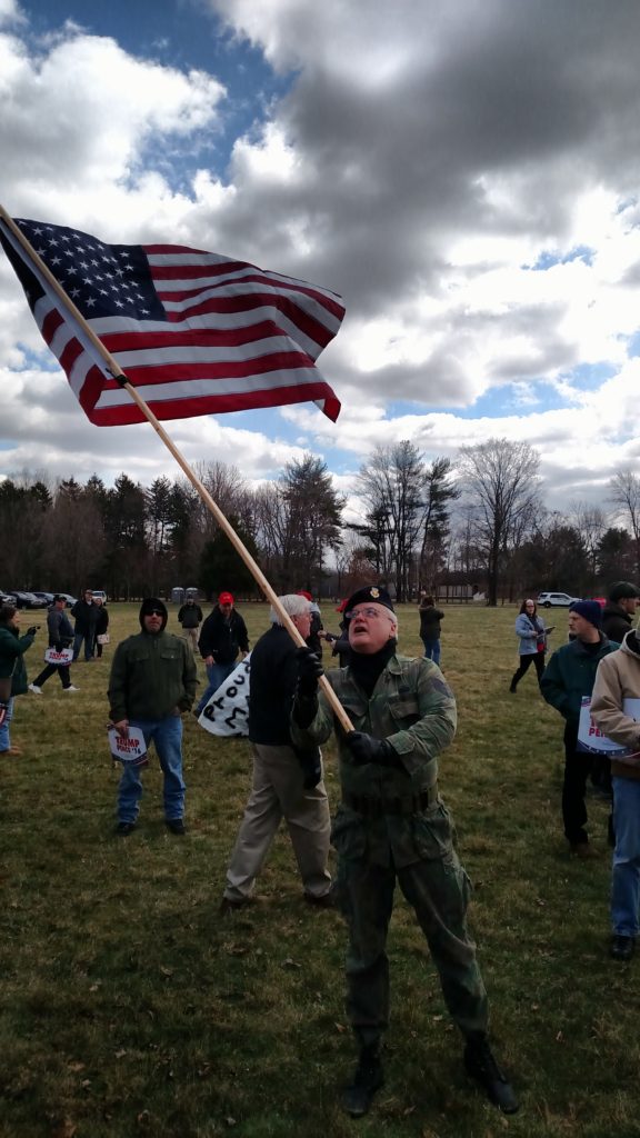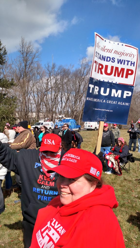 It’s early March, Trump’s been in office for only a little more than a month, and here in Southeastern Pennsylvania, supporters have gathered to rally in support of a sitting President. The event website promised a “sign waving rally [that] will be peaceful, positive, patriotic, uplifting, and open to anyone that supports an America First agenda.” At least as far as the signage goes, the participants have delivered, bringing hundreds of flags and hand-painted cardboard signs and banners.