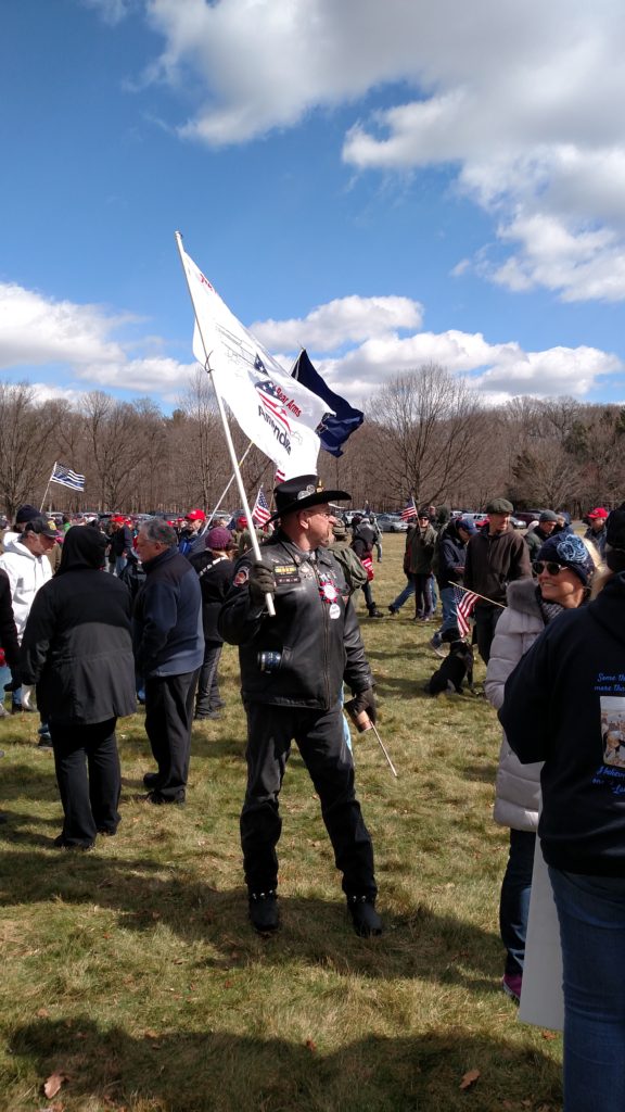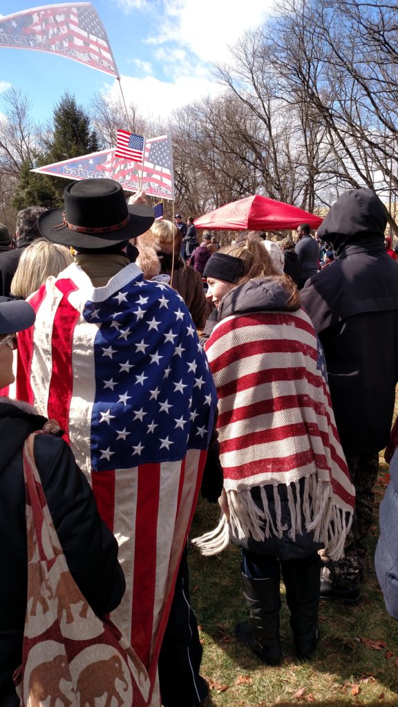 The crowd itself is full of middle-aged and older men, bikers in leather outfits, dudes in camo hunting gear, men in work clothes. But there are dozens of families, toddlers in Trump gear, and a not-inconsiderable number of women carrying tiny dogs in their arms and purses. The cars in the lot are all sorts – not just pickups, minivans, and SUVs, but more than a few luxury cars too. The organizers have proclaimed that “unlike those protesting against President Trump’s vision, we are a diverse coalition that are the heart and soul of America that wants our nation to fulfill our potential, as the greatest nation on God’s green earth!” Practically speaking, though, the sea of faces is overwhelmingly white. I count maybe two-dozen people who might be Latino, and fewer still Black people. In fact, there are more Black folks on the stage in front of the cameras than there are in the crowd itself.