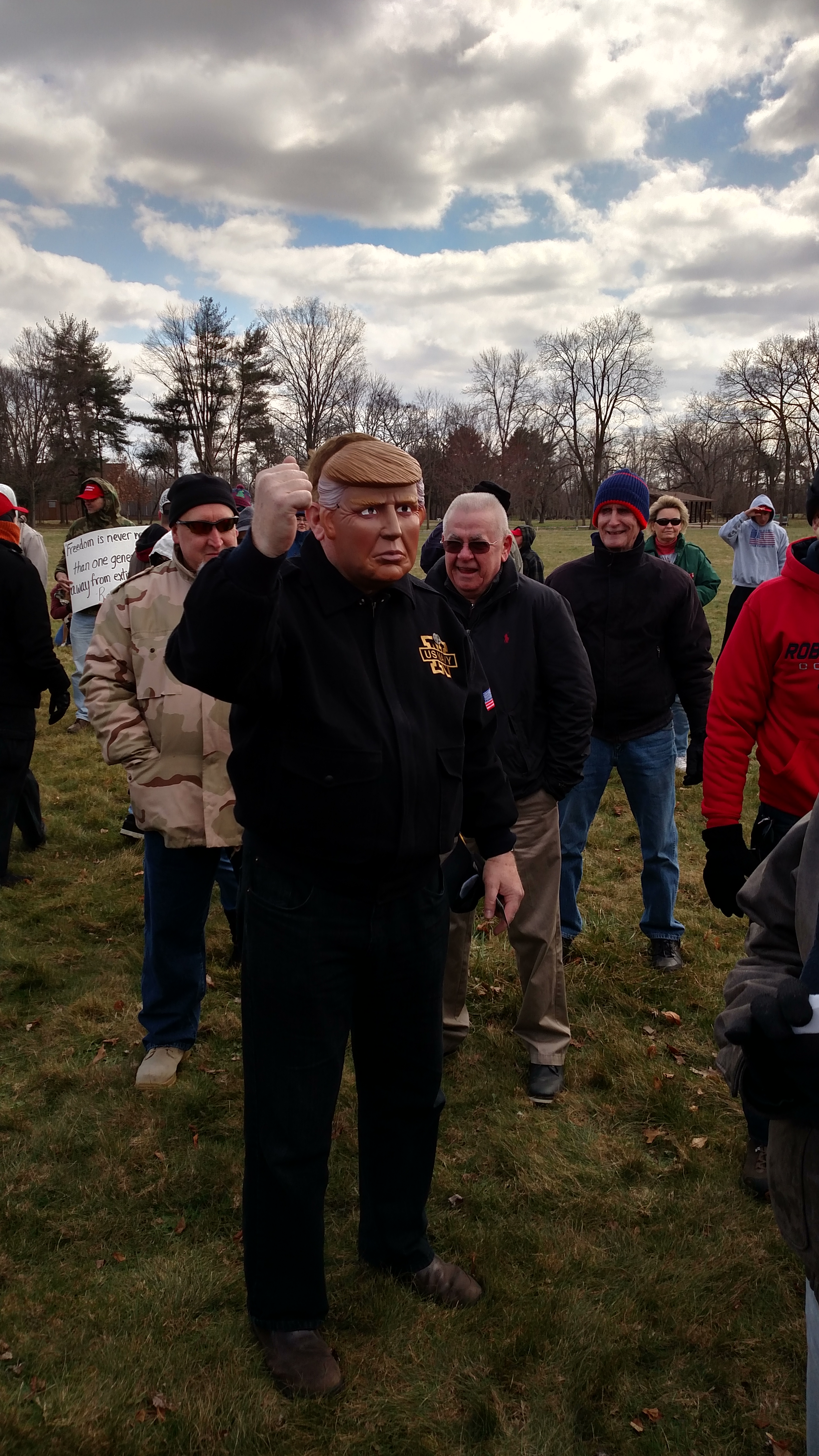 After a song and a prayer, the event gets underway in earnest. The organizer, Jim Worthington, is a local businessman, the owner of an athletic club who spent some $30,000 campaigning for Trump and went as a delegate to the Republican National Convention. He’s lean and photogenic, and gets visibly emotional talking about Trump, a “great man,” and the “movement” this rally represents. He’s also relentless in extolling “positivity,” telling everyone in the audience that we should appreciate the media: “We’re grateful they came out in the cold to the cover this, we should thank them.”