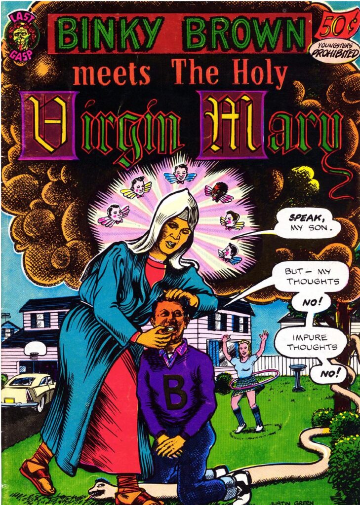 Against this backdrop, in 1972, a 40-page story emerged that helped change the history of the medium, inspiring the modern genre of autobiographical comics with perhaps the first spiritual memoir in comic form. Binky Brown Meets the Holy Virgin Mary by the late Justin Green (1945 – 2022) helped demonstrate that radical vulnerability and the confession of one’s most personal secrets can be even more transgressive and transformative – for oneself and others – than the shock value of hyperviolence and lurid sexuality.