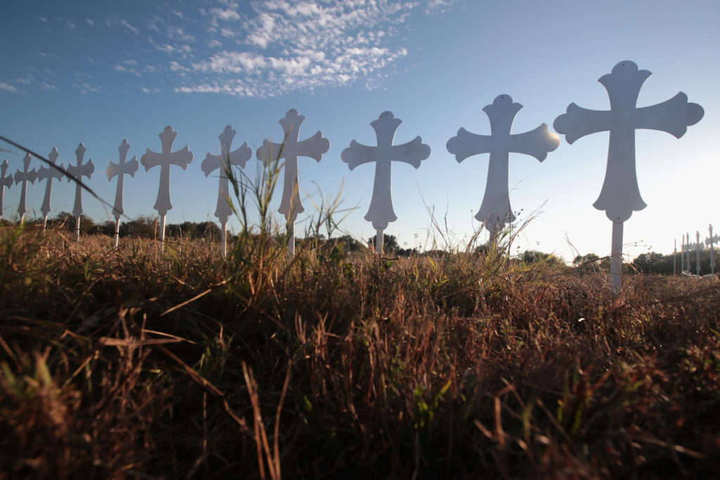 Crosses stand in a field on the edge of town to honor the 26 victims killed at the First Baptist Church on November 6th, 2017, in Sutherland Springs, Texas.