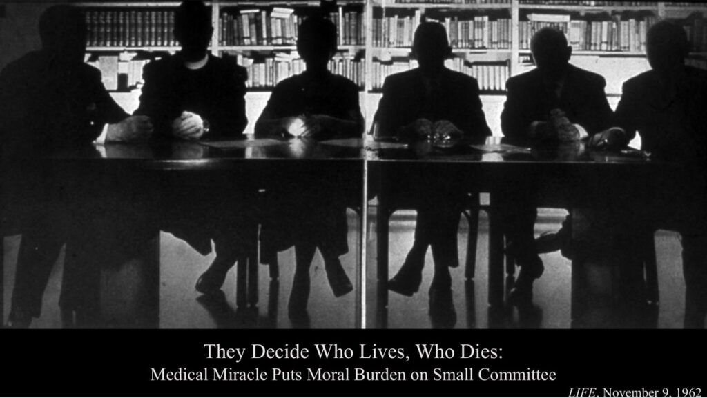 The God Committee mobilizes a powerful history of how modern clinical bioethics began. In 1961, the Seattle Artificial Kidney Center at Swedish Hospital established a seven-person committee to determine who should have access to the limited number of life-saving hemodialysis machines. The committee consisted of unpaid private citizens chosen by the King County Medical Society and included a lawyer, a minister, a banker, a housewife, a state government official, a labor leader, and a surgeon. The committee deliberated over each potential patient, following medical recommendations to exclude children and anyone over 45 but operating without any real guidelines. Designed to protect doctors from this terrible and awesome responsibility, the committee was, in many ways, playing God. Only later nicknamed “The God Committee,” the group’s work was chronicled in a 1962 article in Life magazine by Shana Alexander. Readers responded to the lack of clear framework by which the committee made decisions, particularly given the tremendous consequences to selection and exclusion. While more artificial kidney machines soon became available, making the work of the committee obsolete, the fundamental challenges of rationing remained, leading to the establishment of more robust bioethical criteria for practical allocation of scarce resources.